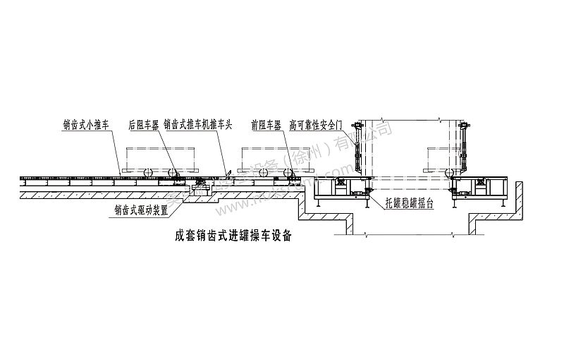 操車系統(tǒng)成套技術(shù)設(shè)備是由銷齒推車機、搖臺(搭接搖臺、托罐搖臺、托罐鎖罐搖臺)阻車器、安全門、液壓系統(tǒng)、電控及信號系統(tǒng)等部分組成。該套系統(tǒng)靈活組合和布置,可以滿足各礦井不同提升形式、運輸方式和現(xiàn)場安裝空間尺寸的要求。
